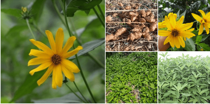 잎과 덩이뿌리에 천연 인슐린이라 불리는 '이눌린'을 많이 함유하고 있어 당뇨병에 탁월한 효능이 있다고 알려져 왔다. 약리실험에서 형당 강하 및 해열 작용이 있는 것으로 밝혀졌으며, 식용˙약용˙관상용으로 가치가 높다.
